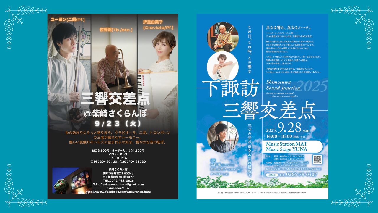 9月23日の会場は調布市菊野台の「柴崎さくらんぼ」さん。9/28日は下諏訪の「ミュージックステーションMAT」さん。まるで優しいシルクに包まれるような、心安らぐ音色をぜひお楽しみください。